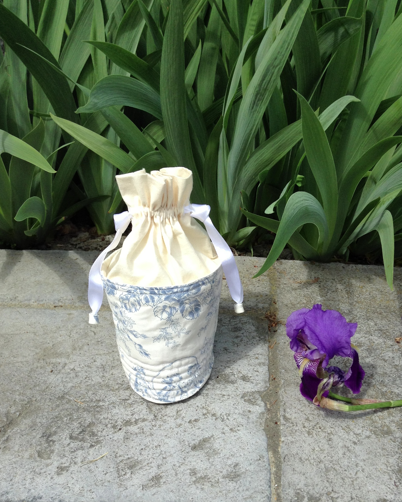 Au jardin les iris ont éclos. Et ça sent bon ! Une ambiance romantique à souhait pour une nouvelle pochette en toile de Jouy.