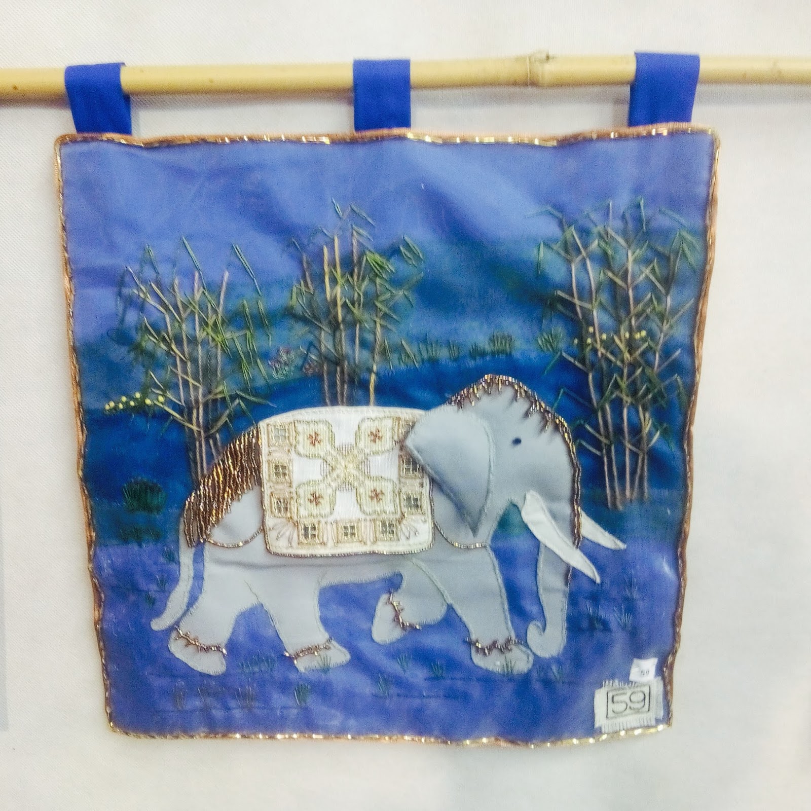 La deuxième exposition était en fait l'exposition d'une centaine d'oeuvres réalisées dans le cadre du concours organisé par le salon. Avec un même pack composé d'une toile de coton bleu emblématique de l'atelier d'Indra de 40 X 40 cm, une toile de coton gris pour l'éléphant, le patron de l'éléphant et une bobine de fil diamant doré et le même mot d'ordre "un carnet de route pour l'Inde", les interprétations ont été très variées et originales.